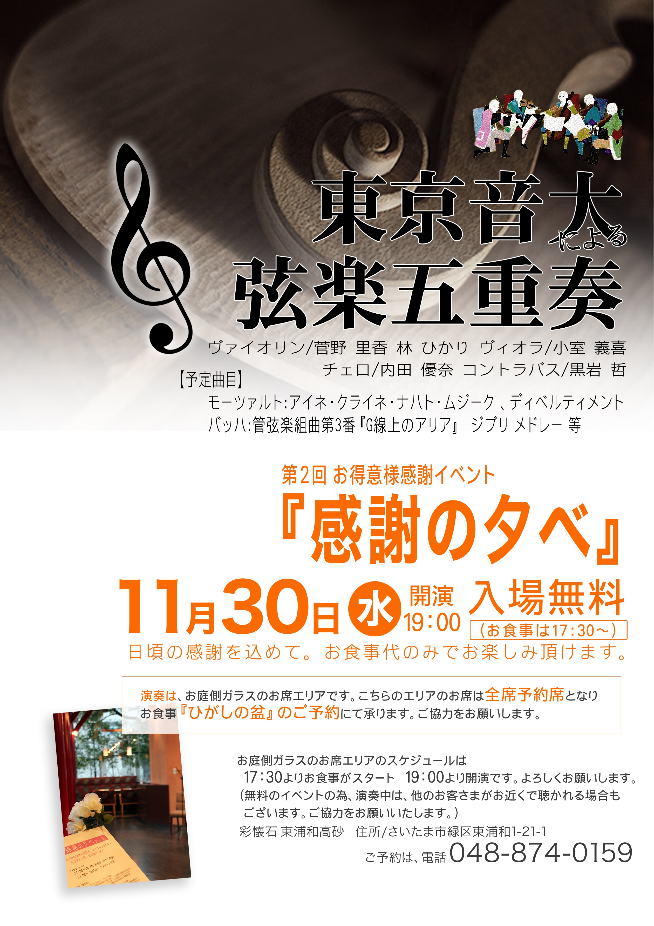 ご好評いただきました感謝の夕べの第2回目決定!!今回は、東京音大生による弦楽五重奏。モーツァルト、バッハなど有名どころの選曲でお楽しみいただけると思います。お庭の見えるガラス席での演奏です。お食事を楽しんだ後の優雅なひと時。完全予約制。『東の盆』のお食事代のみでお楽しみいただけるお得意様感謝イベントです。詳しくは、パンフレットをご覧ください。