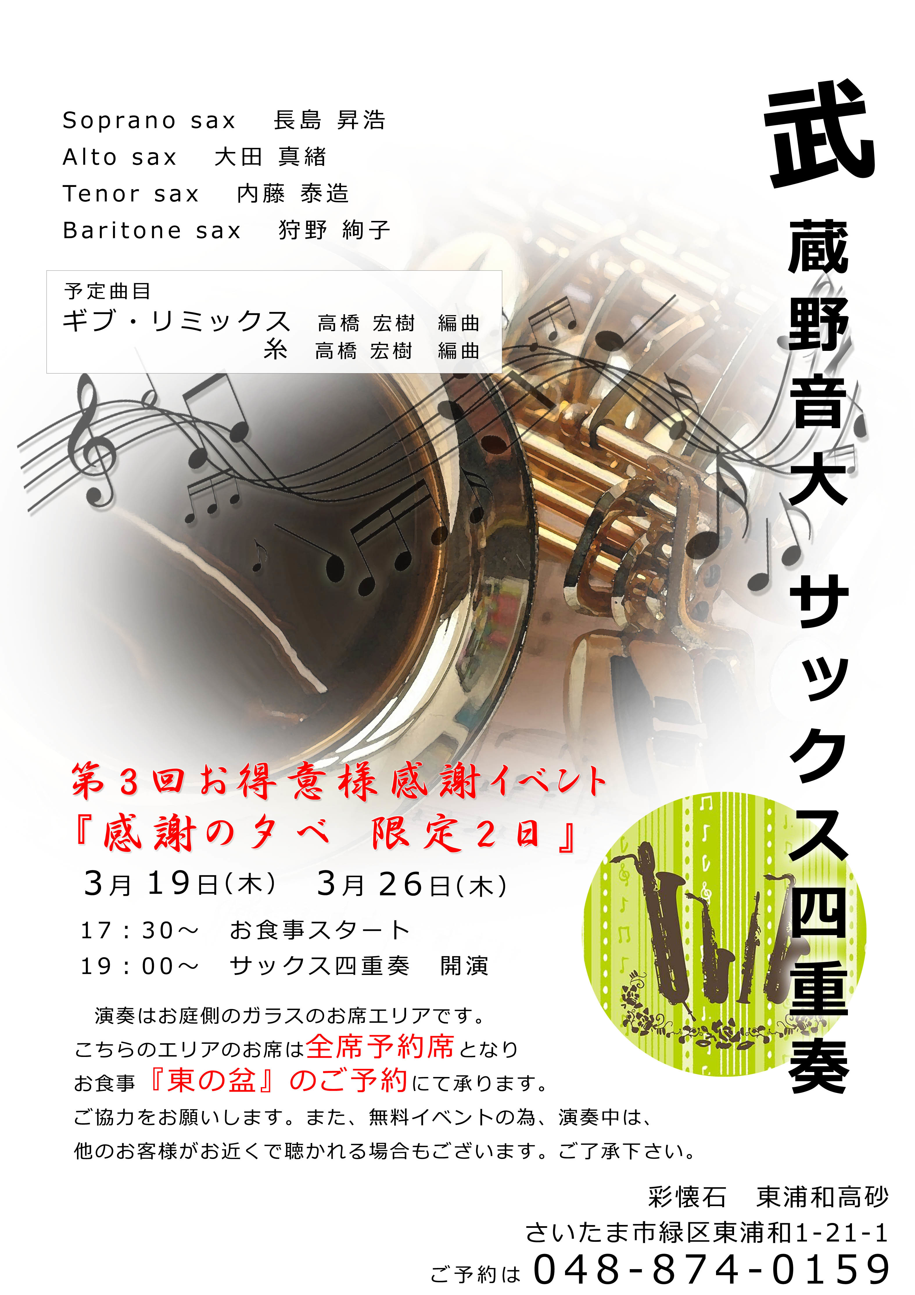 ご好評いただきました感謝の夕べの第3回目決定!!今回は、2日間。武蔵野音大生によるサックス四重奏。ギブ・リミックス、糸を選曲。迫力のあるサウンドが楽しめる構成です。前回同様、お庭の見えるガラス席での演奏です。お食事を楽しんだ後の楽しいひと時。完全予約制。『東の盆』のお食事代のみのお得意様感謝イベントです。詳しくは、パンフレットをご覧ください。
