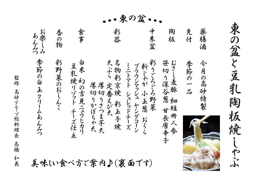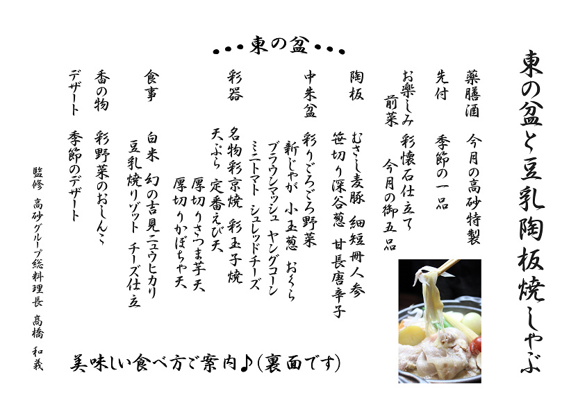 7月1日より、夏~晩秋の『東の盆と豆乳陶板焼しゃぶ』がスタートします!!