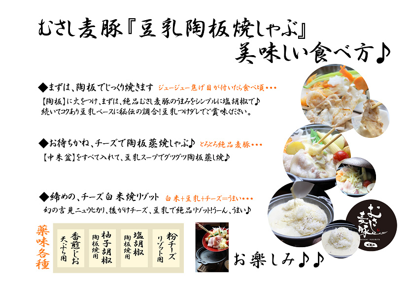 バームクーヘンで育った埼玉県自慢の『むさし麦豚』を料理長自慢の豆乳ベースの出汁で焼いたり蒸したり。もちろん、懐石仕立ての食前酒、先付、前菜から始まり、デザートまでお楽しみ頂けます。