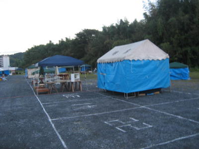 9月17日(金) 前日13:00〜 搬入開始… そして、なんとか総合受付もテント設置! あたふた準備しているうちに、夕暮れ… 明日から天気は良さそう! 皆、がんばるぞ!! |