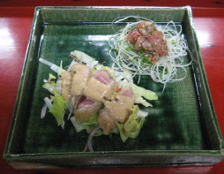 | ↑Cいさきのたたき(奥) 味噌と醤油で味が付いてます。 まぐろの揚たたき(前) 当店おすすめ!表面をフライで軽く揚げて にんにくのきいた特製ソースで。 サラダも兼ねた一品ですw |