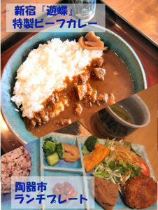 陶器市特別メニュー (もう陶器市の定番メニューです) 特製プレートランチ 800円 御飯は 栗おこわ、筍御飯 雑穀米、白米から選べました。 おなじみの 新宿「遊蝶」特製ビーフカレー 800円 いくらと鮭の親子丼 1200円 ※後半に。むき栗が手に入らなくなり (季節商品らしく) 栗おこわがお赤飯となる ハプニングがありました(^^;) |