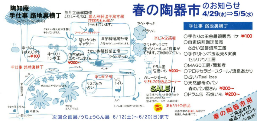 | 2010.4.29(木)〜5.6(火) 春の 益子陶器市 8日間開催 期日的に、長〜い、という訳ではありませんが、 その中身は休日・祝日がほとんど!という 大型連休だった、春の陶器市です。 たくさんの方に協力&参加して頂けました。 ありがとうございましたv |