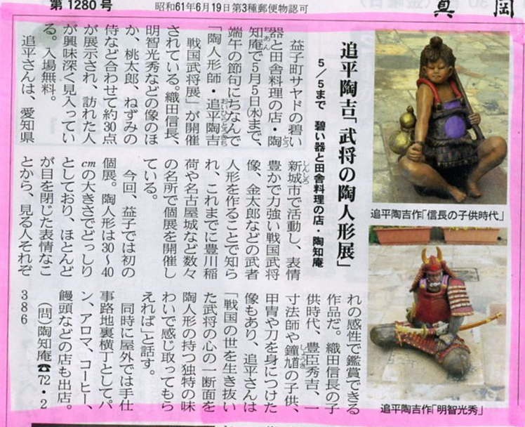 陶人形師 追平陶吉「戦国武将」展 碧い器 アートスペースギャラリー はな 2010.4.24〜5.5まで 開催されました。 この模様は 「真岡新聞」に掲載されましたw |