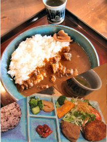 陶器市特別メニュー (もう陶器市の定番メニューです) 特製プレートランチ 800円 御飯は お赤飯、たけのこ御飯 雑穀米、白米から選べました。 シェフのまかない 特製ビーフカレー 800円 (お持ち帰りも出来ます) いくらと鮭の親子丼 1200円 ひとつひとつ手作りしております。 食事もお茶も、碧いうつわで! |